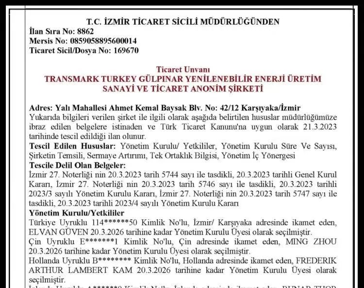 近日,开山集团股份有限公司的全资公司OME (Eurasia) Pte., Ltd.(以下简称“OME Eurasia”)与Sonsuz Enerji Holing B.V.(以下简称“Sonsuz”)已在伊兹密尔完成Transmark turkey Gulpinar Yenilenebilir Enerji Urtetim Sanayi(以下简称“TTG”)公司的股权变更手续,完成了OME Eurasia与Sonsuz此前签署的《TTG公司股权认购暨股东协议》所规定的交割程序。TTG新股东结构及董事会成员已在土耳其工商机构进行登报。至此OME Eurasia已成为拥有TTG49%股份的股东,Sonsuz控股51%。